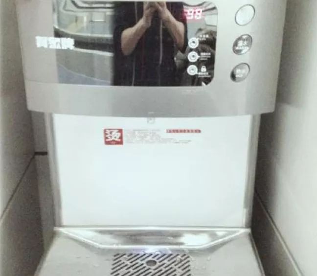 我觉得很奇怪,怎么回事?然后我就拿着杯子去看了一下,这是我看到的情况。热水器的出水按钮是红色的,我猜很有可能是因为是红色按钮,所以大叔没按。