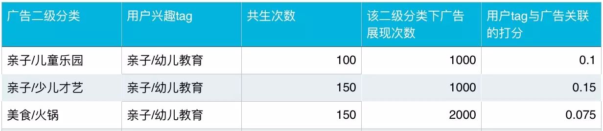 “美食/火锅”更为大众化,因此访问量远大于“亲子/儿童乐园”,上列访问量虽为虚构,但与实际认知相符。上列表格想要说明的是,像“美食/火锅”这样的广告分类,可能与很多用户标签的共生次数都很高,但由于它本身是大众化的分类,因此分母取值也很大,则实际关联打分就会很小(除非是强相关兴趣)。