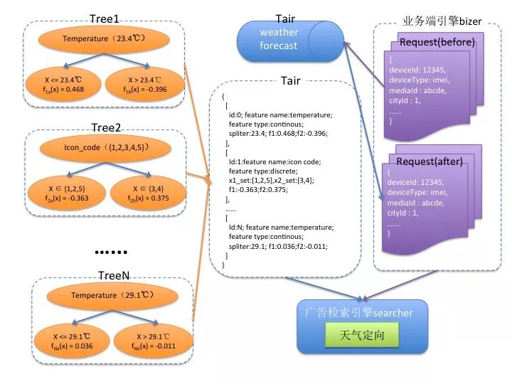 经过Gentle AdaBoost训练出的多棵树模型,以JSON格式写入Tair中;线上在获取ADX请求后,根据Tair中已经写好的天气预报信息,加载当前小时当前城市的天气情况,检索端根据当前天气和模型,对广告进行打分和排序。