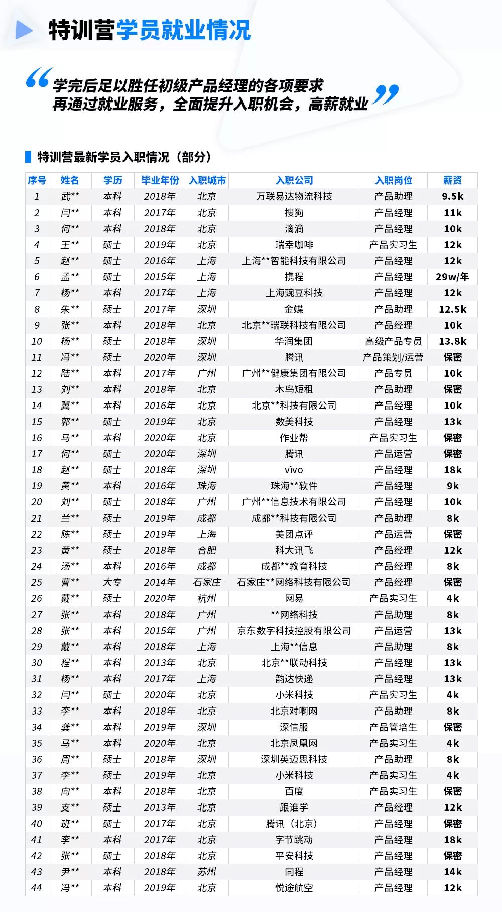 学习的最终目的是成为企业需要的产品人才,成功就业。业内其他产品课程,听完课就“戛然而止”了,导致很多学员依旧不懂互联网公司对产品经理有何要求,如何针对性优化简历,如何寻找适合自己的岗位机会,如何在面试中充分展现自己的产品能力,如何进行合理的薪资谈判……