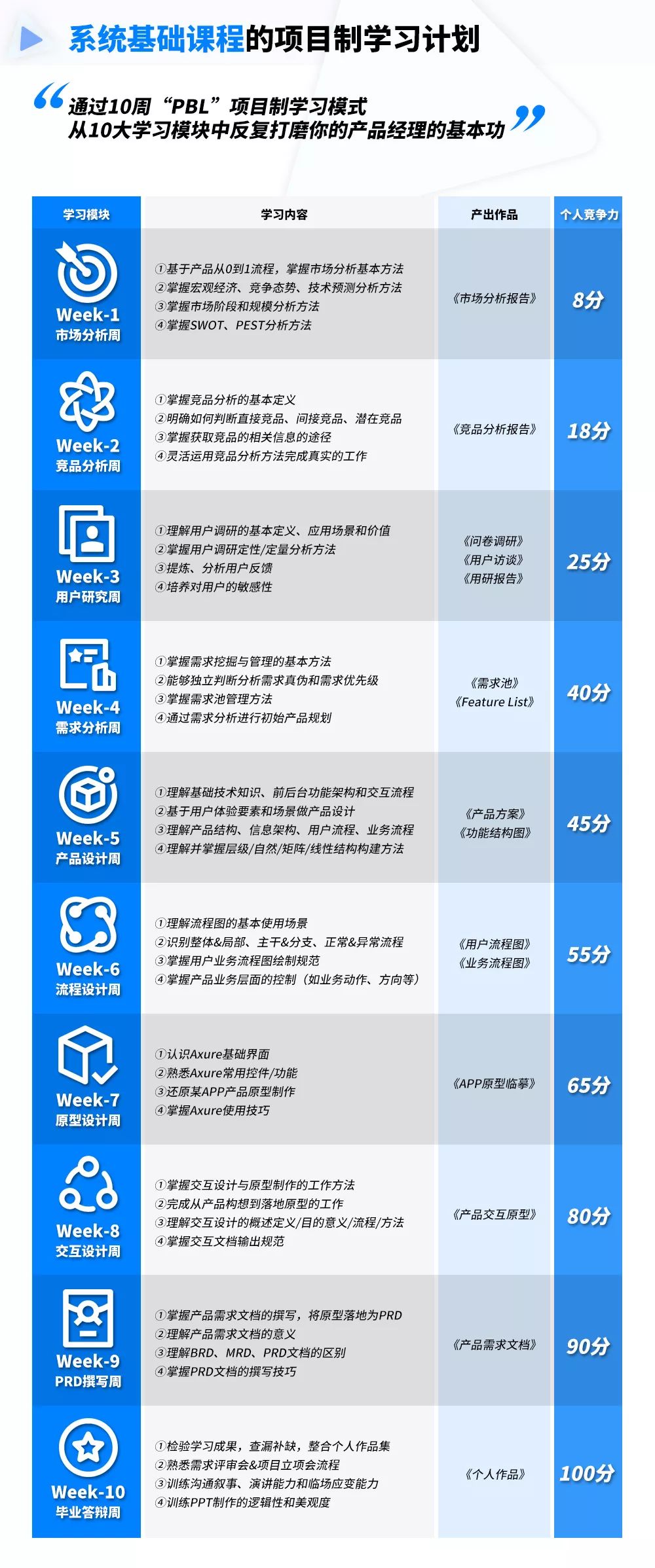 与产出作品相匹配的,是为你量身定制的“10周线上陪伴式教学模式”,所学内容源自BAT产品培养体系和市场上企业的招聘需求,每一周你都会通过“大量刻意练习+输出倒逼输入”掌握一个产品模块的方法论,10周后你就能达到或超过不同企业的招聘标准。