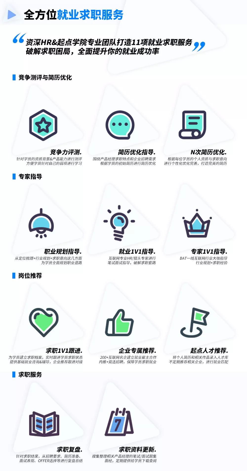 事实上,产品技能和求职技能同样重要,求职技能高低往往决定你能否拿到产品offer。因此,特训营另一个特色在于“就业”,基于企业招聘需求提供11项求职就业服务,由就业服务老师、招聘管家全程为你给你支招,知己知彼打有准备的仗,直到你能拿到Offer,成功入职为止。