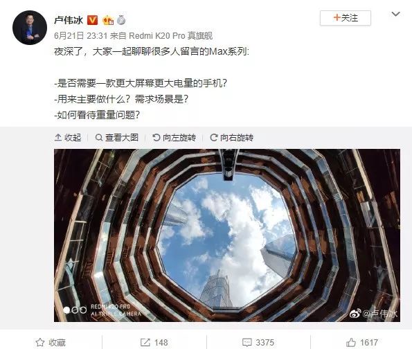 就在雷军放出小米品牌放弃 Max 系列的当晚,作为小米双品牌之一的 Redmi,总经理卢伟冰在深夜抛出关于 Max 系列的话题,谈论关于大屏幕大电池手机的需求场景以及重量问题。这也让我们不禁猜想,以后是否还会有大屏手机,其名字是否是 Redmi Max 呢?
