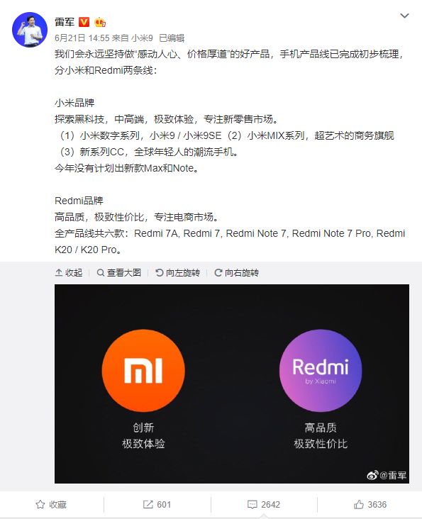 令人遗憾的是,雷军在微博中也说到,小米今年将不会出新款 Max 和 Note 系列新机,目前小米品牌将以小米数字系列、小米 MIX 系列和小米 CC 系列三个系列为主。