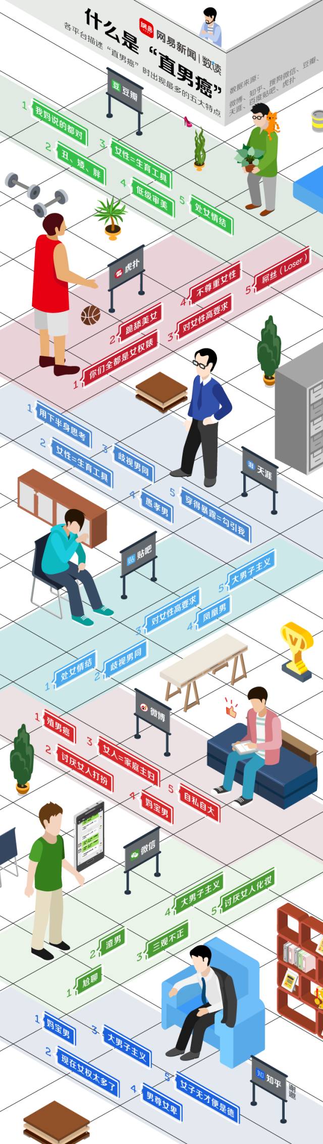 为了搞清楚网络上频繁出现的“直男癌”到底是什么,数读菌从七个社交平台暴力爬取了有关“直男癌”逾300万字的文本数据,包括6.3万条微博、7240篇微信文章、154个知乎问题、1239个豆瓣话题、470个天涯帖子、400篇贴吧帖子、199篇虎扑帖子,以及这些帖子下的全部回复,希望能找到一个答案。