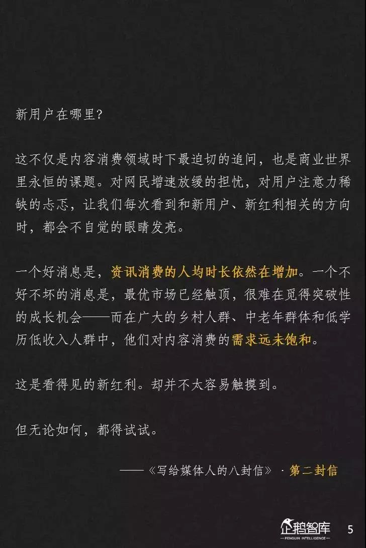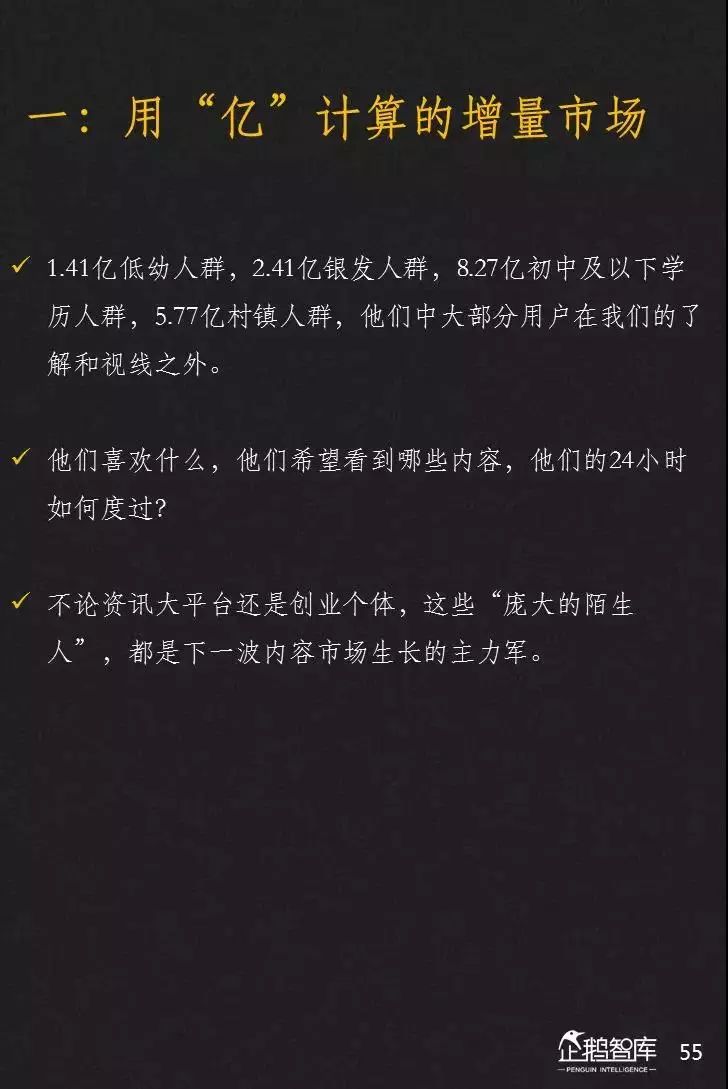生长趋势一:新用户红利。在广大的乡村人群、中老年群体和低学历低收入人群中,他们对内容消费的需求远未饱和。