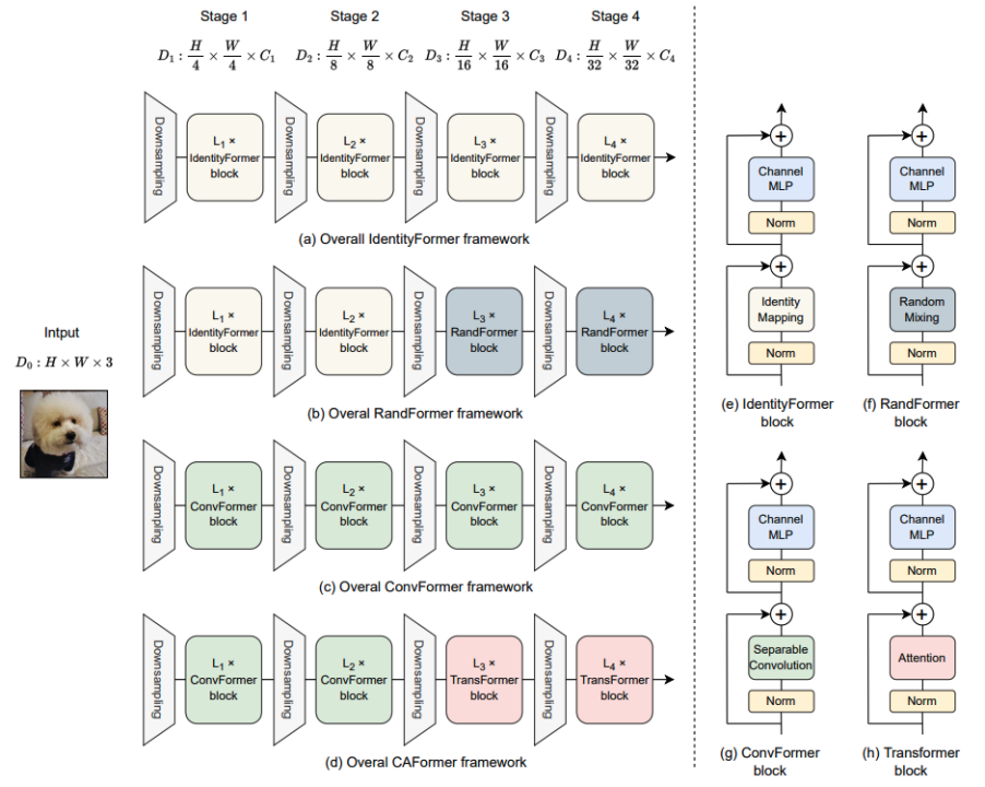 图 2:(a-d)IdentityFormer、RandFormer、ConvFormer 和 CAFormer 的总体框架。与 ResNet 类似,模型采用四阶段架构,阶段 i 具有特征维度为 Di 的 Li 个 block。每个下采样模块由一层卷积实现。第一个下采样的 kernel 大小为 7,stride 为 4,而后三个下采样的 kernel 大小为 3,stride 为 2。(e-h) IdentityFormer、RandForemr、ConvFormer 和 Transformer block 的架构,它们的 token mixer 分别为恒等映射,随机混合,可分离卷积和原始 self-attention。