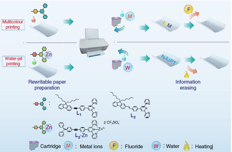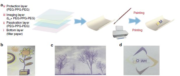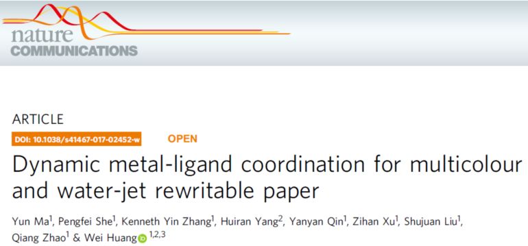 1月10日,南京邮电大学赵强、西北工业大学常务副校长黄维和他们的团队在Nature Communications在线发表题为Dynamic metal-ligand coordination for multicolour and water-jet rewritable paper论文,报道一种新型的可复用纸,突破了这一瓶颈。这种可复用纸通过活性金属配体配合物的诱导作用,在印刷过程中达到发光或成色的目的。他们使用含有不同金属盐的水溶液作为油墨,令金属盐与纸张上的分子相互作用,从而实现了多色喷墨打印。这种方法打印出来的图像可以保留很长时间(通常在 6个月以上),也可以根据需要消除。这无疑是令人振奋的结果。有理由认为,这种新型的可复用纸解决方案将会深刻地影响未来的印刷技术。