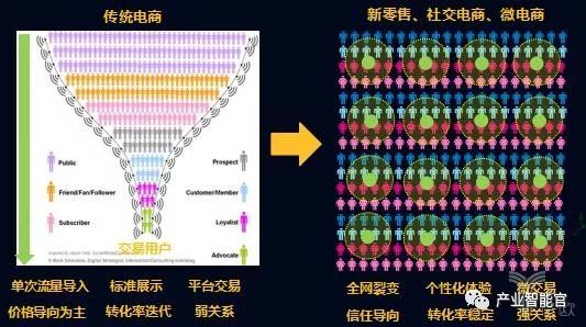 传统的电商的流量分发是漏斗的逻辑,单次流量导入,价格导向为主;而社交电商新零售的裂变是社群的裂变,形成一个关系圈的裂变,而且是把微交易全网裂变起来,是信任关系导向。