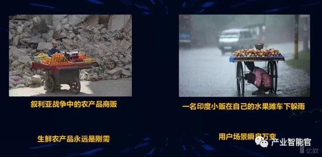 结合生鲜农产品这块我找了两张图,一个是叙利亚整个战争当中的农产品商贩,在恶劣的环境当中还在卖农产品。我们也看到印度小贩在自己的水果摊下躲雨,无论战争多么残酷,生鲜农产品一定是刚需的市场,当你做刚需的市场一定有投资价值,这里面有用户黏度。