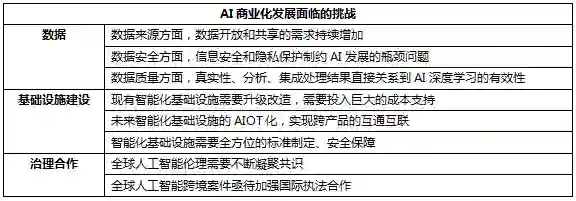 在过去技术驱动阶段,AI商业化主要依托算法、算力和数据等基础条件,如今在全产业链的参与下,则更依赖厂商对商业场景的判断,战略部署效率和自我造血实力。未来,AI商业化发展将持续面临来自数据、基建、治理三方面的挑战。