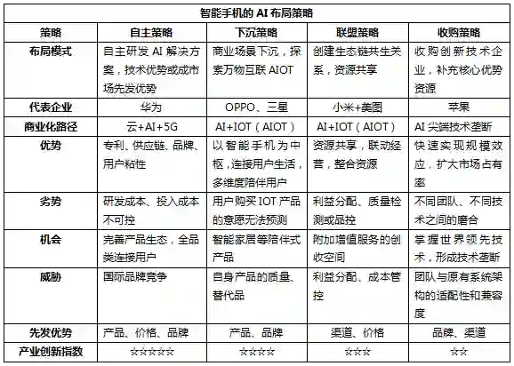 节点财经(ID:jiedian2018)将其智能手机厂商AI商业化的布局策略总结为:“自主策略”、“下沉策略”、“收购策略”及“联盟策略”,代表企业分别为华为、OPPO/三星、“小米+美图”以及苹果,为您解读手机AI的众生相。