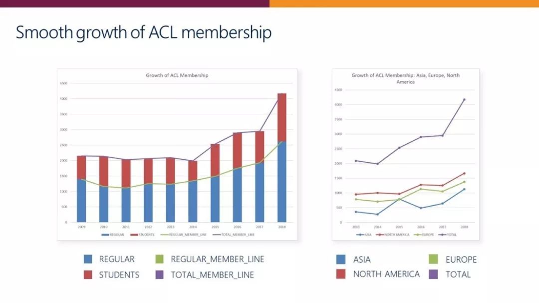 ACL 大会先后在亚洲举办过七次,这极大地促进了促进亚洲 ACL 会员的增长,AACL 也应运而生。成立于2018年的 AACL 服务亚太地区57个国家和地区的 ACL 会员,明年计划举行首届 AACL 会议。AACL 的成立进一步推动了亚洲 NLP 的发展和 ACL 成员的增长。