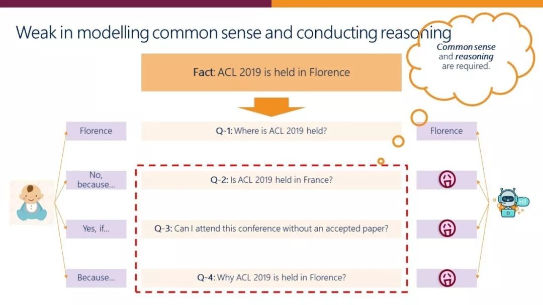 在这个例子中,鉴于“ACL 2019在佛罗伦萨举行”的事实存储在知识库中,计算机可以回答第一个问题,而对于小孩子来说很简单的后三个问题,计算机却不知道该怎么回答。其原因在于目前的自然语言处理还没有很好地解决常识和推理的问题。