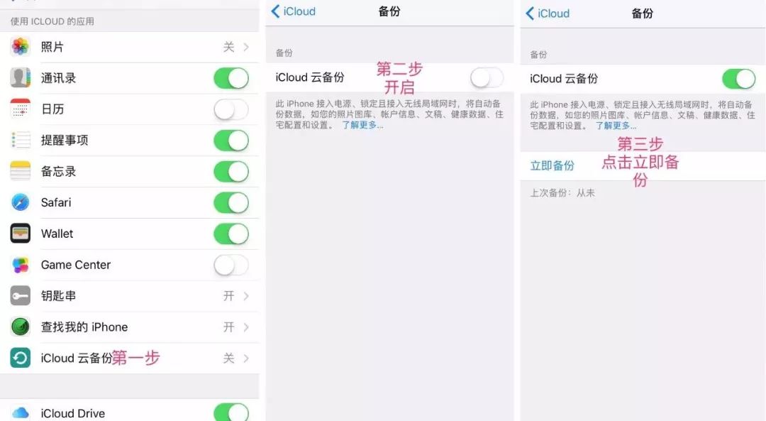 打开“系统设置- iCloud - iCloud 云备份-打开开关-点击立即备份即可。