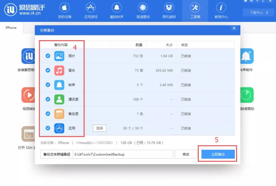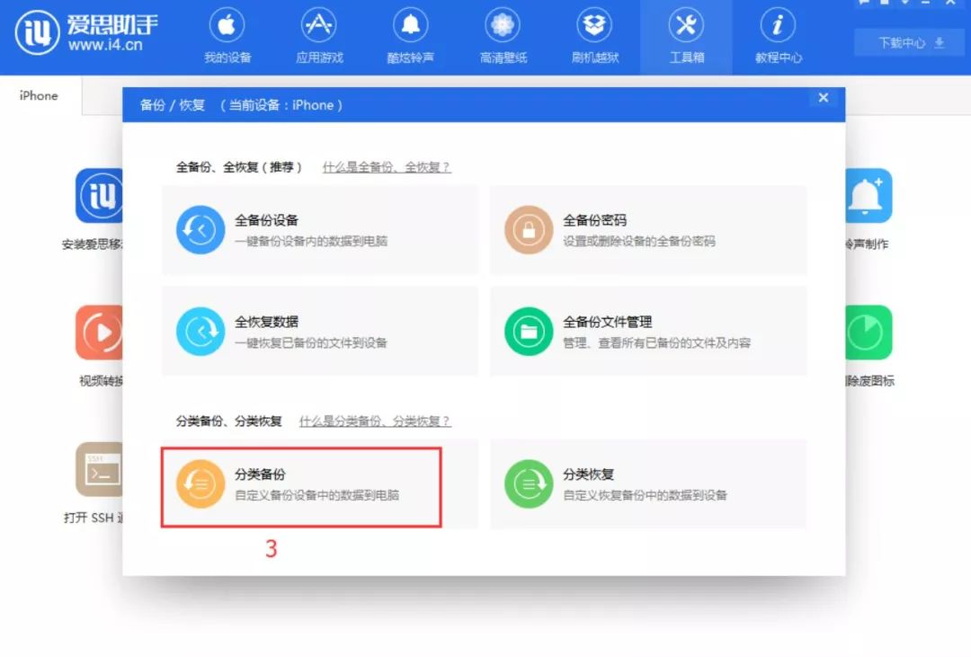 操作步骤:打开爱思助手 PC 端,将移动设备连接到电脑,点“工具箱-备份/恢复-分类备份”,在分类备份界面选择自己需要备份的内容后,点“立即备份”按钮。