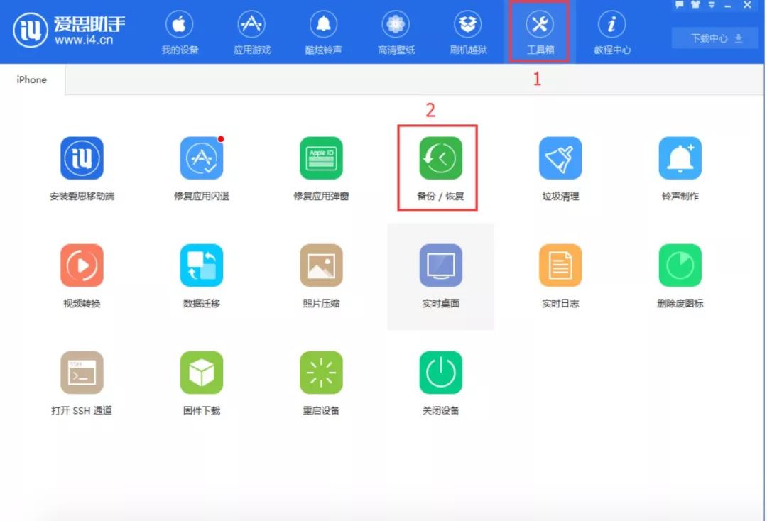 操作步骤:打开爱思助手 PC 端,将移动设备连接到电脑,点“工具箱-备份/恢复-全备份设备”,在全备份界面中点“立即备份”按钮