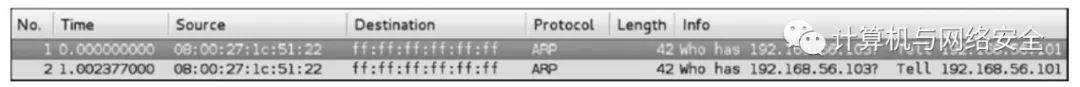 我们使用Wireshark观察arping运行期间的网络数据(见图5)。