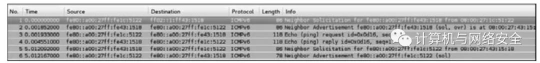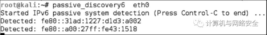 这个程序只是在监听过程中筛选ARP请求和ARP回复,然后进行相应的分析。在刚才的例子里,passive_discovery6发现了两个IPv6地址,这两个地址如下所示。