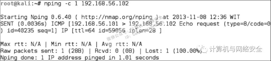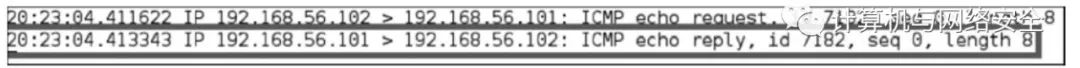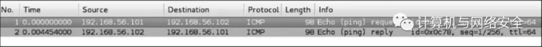 从中可以看出,我们自己的主机(192.168.56.101)向目标主机(192.168.56.102)发送了一个ICMP echo request数据包。因为目标主机在线且允许受理ICMP echo request数据包,它向我们的主机发送回ICMP echo reply数据包。