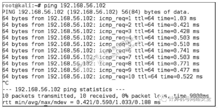 在Kali Linux 里,默认情况下在按下Ctrl-C 之前,ping 指令会一直运行下去。