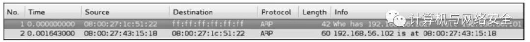 可从图5中看出,本机的网卡(MAC 地址为08:00:27:1c:51:22)发送了ARP广播(接受方MAC地址为ff:ff:ff:ff:ff:ff),询问192.168.56.102的MAC地址。如果这个IP地址存在,该主机将其MAC地址(08:00:27:43:15:18)通过ARP协议进行回复;即返回图5中第2个数据包。