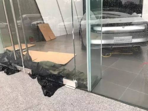 再往前面走,绕到乐视大厦的东侧,就是摆放乐视超级汽车LeSEE Pro的陈列室。不过这款凝聚了贾跃亭极大梦想的“电动化、智能化、互联网化、社会化”的“完整的汽车生态系统”,只是安放在一间约卧室大小的房间内,车 身下面是凌乱的电线,墙角摆放着纸盒和杂物,而且因为下雨浸水,房间门口的玻璃门下,被塞满用来防水的沙袋和塑料袋。
