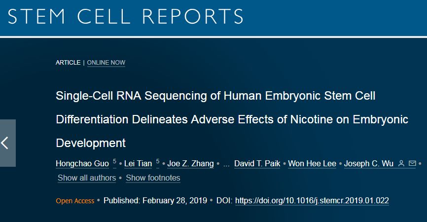 由Stanford心血管研究所所长Joseph C. Wu博士和Simon H. Stertzer领导的最新一项研究表明,他们开发的一种人类胚胎干细胞(hESC)模型,可以为尼古丁对发育中胎儿体内个体器官和细胞的影响提供新的见解,也可用于优化药物和环境毒性筛查。