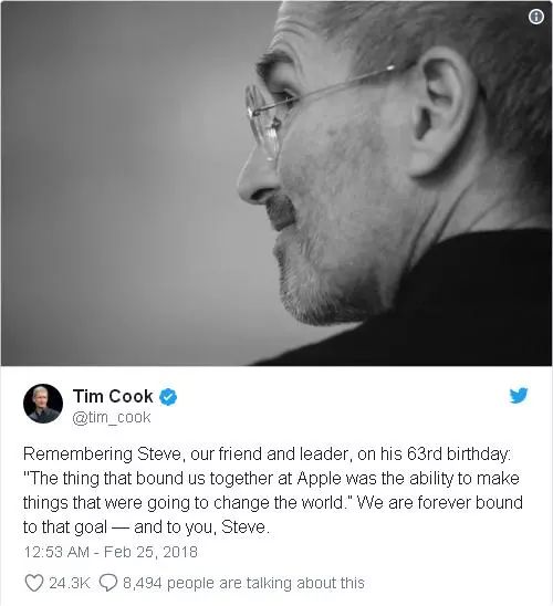 乔布斯生日当天,库克在推特上发文纪念称,“在我们的朋友、领袖——史蒂夫63岁诞辰纪念日里,让我们铭记他的遗训:‘我们团结在苹果公司,就能够做出改变世界的事情。’我们将永远牢记这一目标,永远怀念你——史蒂夫。”