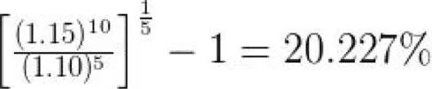 这是一道经典的期限结构的题目。你的脑海里第一反应应该是如下的思想:前五年的利率和后五年的利率必须是平均的,这样才能给出整个10年的利率。也就是说,10%的平均值和未知的远期利率必须是15%。未知的必须是20%。要快速计算出来,请注意,未知(20%)远高于平均值(15%)低于已知(10%)。