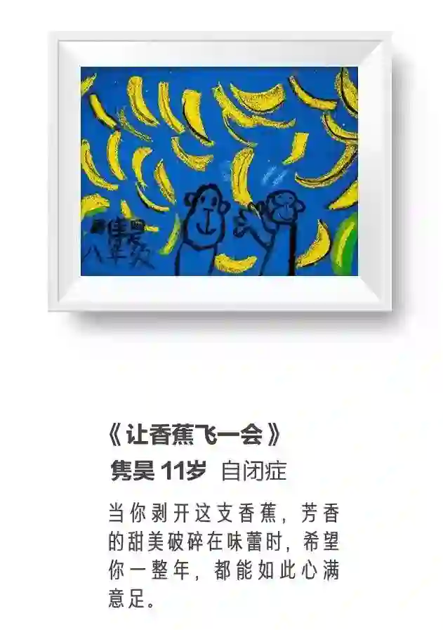 等你看完介绍,会注意到另外一些信息,在每一幅画下方,都有创作者的介绍,简单的几个字这样写道:XX,自闭症/精神障碍/脑瘫,XX 岁。寥寥数语却触动人心,原来画出它们的人,是那些在我们生活中很少接触到的群体,原来他们也有这样的作品。