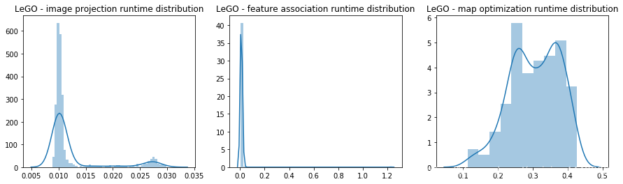 下面是LeGO LOAM的三个主要线程的处理时间的分布曲线。分别是image projection线程(将扫描帧投影到二维矩阵,并做一系列的预处理),feature association线程(与LOAM大概一致,特征点的提取和匹配),以及map optimization线程(低频激发的全局优化线程)。