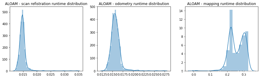 • A-LOAM has the same logical with LOAM, but its performance is much worse.下面是对ALOAM的三个线程的运行时间的分析(以下的运行测试都是再i5 9300 cpu上进行的),分别是scan registration线程,odometry线程,和mapping线程。其中mapping是进行全局优化的线程,另外两个线程则和实时性息息相关。