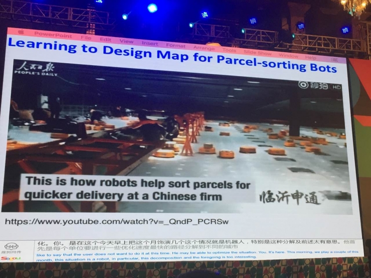 另外一个例子是分拣机器人,它首先是每个单体要进行一些优化,以最快的路径分拣到每个洞,每个洞对应的都是不同的城市。这个环境不是最优的,有可能这个机器人送到北京的信,另外一个机器人送到南京的信,它们可能会碰上,这个效率就不会很高。根据货物的统计特性,设计我把南京的洞放在北京旁边还是放在上海旁边,所以这个环境也是需要很好的考量和设计的。所以在标准的强化设计下你没法做设计,于是我们做了一个新的设计,我们叫Learning to design environments(学习设计环境),可以优化这个场景。