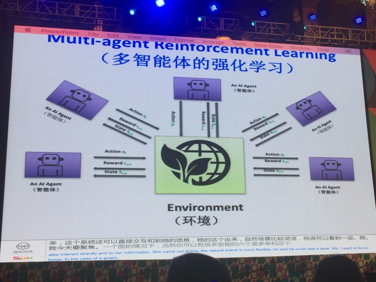 人工智能进入2.0时代,多智体互相协作,互相竞争就是将来发展的一个方向。汪军教授从多智体群体的特征切入,介绍了多智体的强化学习特性。具体表现为:在同一环境下,不同的智体既可以单独处理各自的任务,又可以联合在一起处理优化一个主要的目标方程,而且会根据具体的情况会有不同的变化。