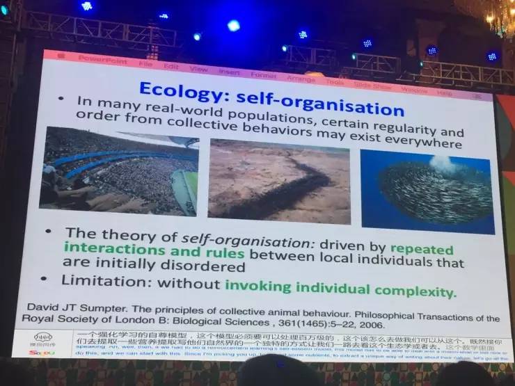 汪军教授讲到了一个生物界的self-organisation(自组织)理论,当一些小的智体遵循这个规则的时候,就会体现一个种群的特质。这些模型可以用宏观的事情解决宏观的问题,但是缺少一种微观的方法去观察这个世界。微观的东西和宏观的现象有什么关系,值得大家以后研究。