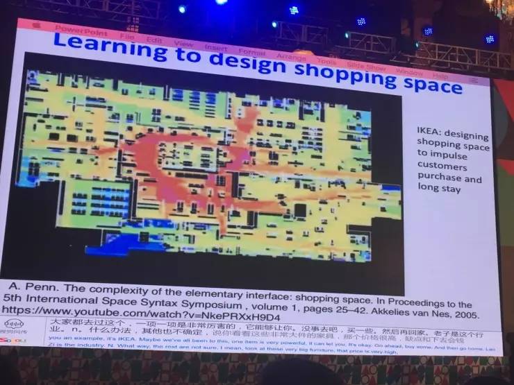 强化学习里面有一个环境,在标准的强化学习的模型里面,假设这个环境是不变的,或者说这个环境有它一定的概率在不断变化,这个概率是不变的,我不一定知道它,但它不是一个Designable(可人为设定的),也就是说它不是去设计这个环境,而是更加适应这个环境。但实际情况下发现,很多场景下,这个环境本身也需要一个适应的过程。举个例子,这是宜家他们的一个购物平面图,这里画的是它的热力图,是根据用户在它的购物商场里面活动的数量画的。这是一个非常好的设计,中间是吃饭的地方,人当然会很多,这个热力图其它的地方相对是比较平均的,平均的好处是你在各个地方放不同的东西,用户都兼顾到了,所以从这个分布来讲,这是很好的情况。但是这也是要设计的,你不可能说一开始的路径安排就是最优化的。我们可以开发一个强化学习的算法,让它强化学习这个环境也能根据这个用户的变化而变化。这是一个建筑系的教授进行的研究,他们做了一个地图模拟人在店铺里面走的情况,根据热力图反馈到铺面设计,来优化用户在这里面待的时间,或者说最大化用户可能消费的情况,可以通过那个情况进行一些优化。