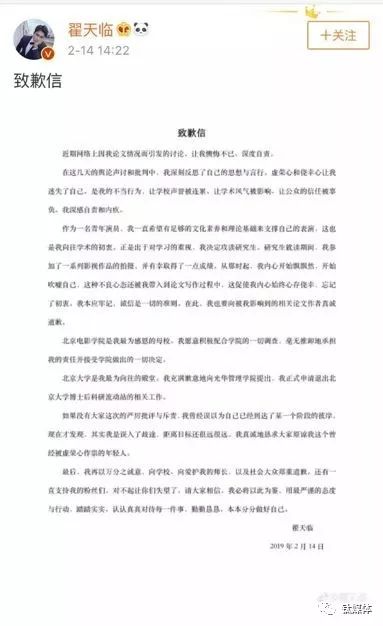 2月14日翟天临终于发声,在各大社交媒体平台发表了格式工整的致歉信,对近期网络上因其论文情况而引发的讨论,“懊悔不已、深度自责”。