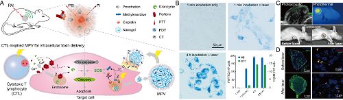 仿细胞毒性T细胞策略构建纳米载体工作原理示意图(A),该仿生纳米载体可在光照下直接将药物递送入细胞浆(B),该过程可在动物水平通过光声、光热和荧光成像实时监测(C),并在组织水平通过共聚焦显微镜证实其肿瘤渗透和胞浆分布(D)