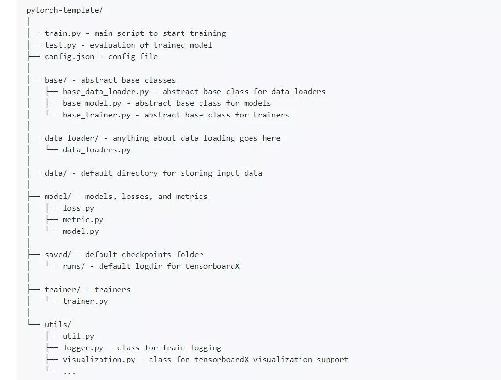 这一部分主要介绍了 PyTorch 其它各种资源,包括教程论文列表、个人的学习经验与实践、好用的 PyTorch 插件等。这一部分相对于其它部分比较散,但是有一些项目还是非常有意思的,例如在 PyTorch 项目模板中,其介绍了构建 PyTorch 项目一般所采用的结构,包括文件夹及文件结构、各文件的编写规范和示例等。这个项目一直在更新,下图展示了构建 PyTorch 项目的一般文件结构: