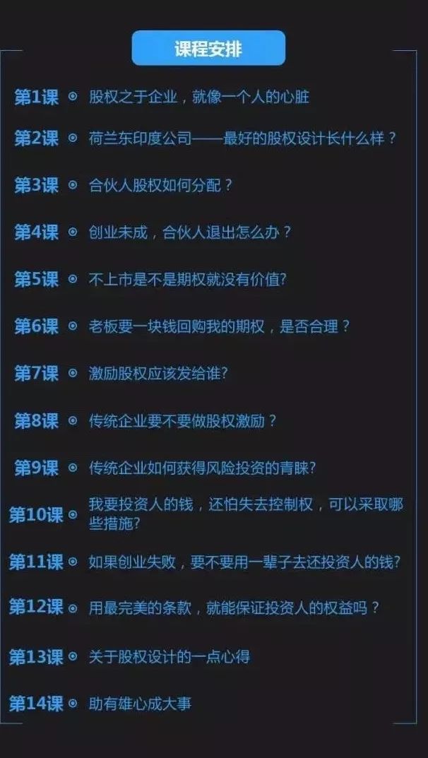 精心准备的课程(14期课程+数十期专项音频答疑):可以让那些经验不足的创业者,迷惑的员工,不理解创业投资模式的投资人、传统企业家,都能有机会学习国内最顶尖的股权思想和经验。