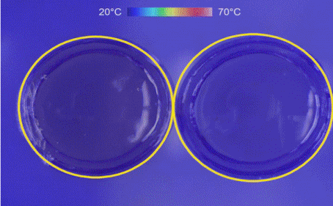 在下图里,研究团队分别对微波炉里两种尺寸的水凝胶珠进行热成像分析。两颗直径1.6厘米的水凝胶珠在交界处出现了明显的热点区域,而两颗直径4.5厘米的水凝胶珠出现了几处分散的热点,分别位于交界处和两颗水珠的内部中心。