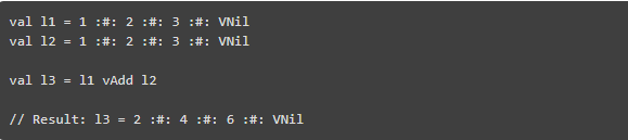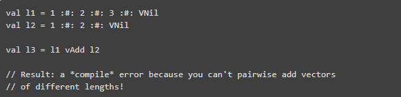 这将创建一个变量l1,它的类型签名不仅指定它Vector是包含的Ints,而且指定它的Vector长度为3.编译器可以使用此信息来捕获错误。让我们使用该vAdd方法在Vector两个之间执行成对加法Vectors:
