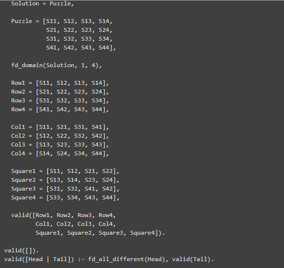 声明性语言的美妙之处在于它允许你在更高层次的抽象中工作:你只需要描述所需输出的规范。例如,prolog中简单数独求解器的代码,只是列出了解决的数独谜题的每行,每列和对角线应该是什么样的: