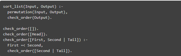 如果您使用像Prolog这样的声明性语言对数字进行排序 ,则应该描述所需的输出:“我需要相同的值列表,但索引中的每个项目 i应小于或等于索引处的项目i + 1”。将以前的C解决方案与此Prolog代码进行比较: