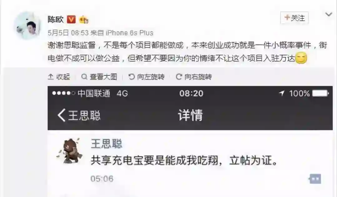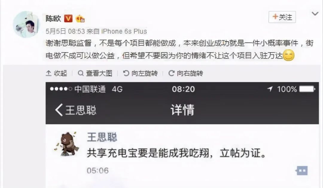 王思聪在朋友圈中称,"共享充电宝要是能成我吃翔,立帖为证。"陈欧则在微博里晒图并回复,"街电做不成可以做公益,但希望不要因为你的情绪不让这个项目入驻万达。"