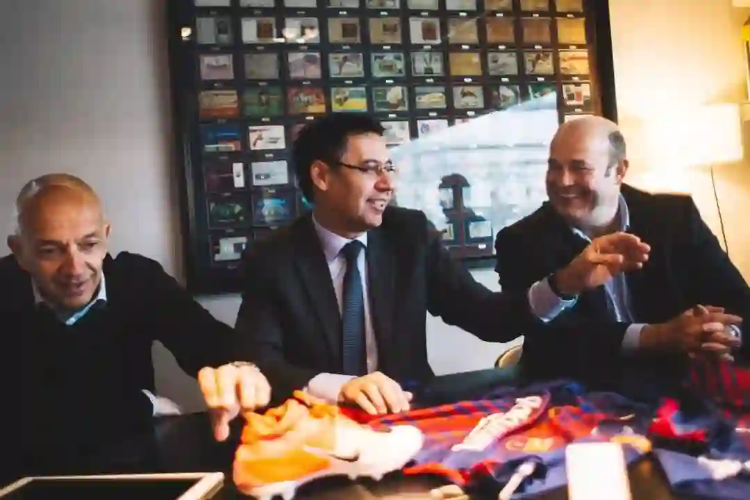 俱乐部主席约瑟普·玛利亚·巴托梅乌(戴着眼镜)与首席执行官奥斯卡·格劳(握着手)最近与耐克会面,讨论赞助事宜。Photograph by Javier Luengo for Fortune