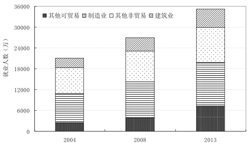 采用与斯彭斯等类似的分类方法,基于中国分别在2004年、2008年和2013年进行的三次经济普查数据,我们把非农产业中依据法人单位(corporate units)进行统计的就业,按照可贸易部门和非贸易部门进行分类,分别观察其增长规模和结构变化。这里,我们特别突出展示占比较大的可贸易部门中的制造业就业,以及非贸易部门中的建筑业就业(图2)。