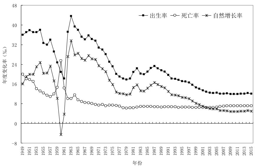 图1显示了中华人民共和国建国以来的人口出生率、死亡率以及(两者之差)自然增长率。如果把20世纪50年代末和60年代初因天灾人祸造成的异常出生率下降、死亡率上升,从而自然增长率下降看作一个外在的扰动因素,剔除其对总体趋势的影响的话,我们整体上可以看到一个符合人口转变规律的变化过程。