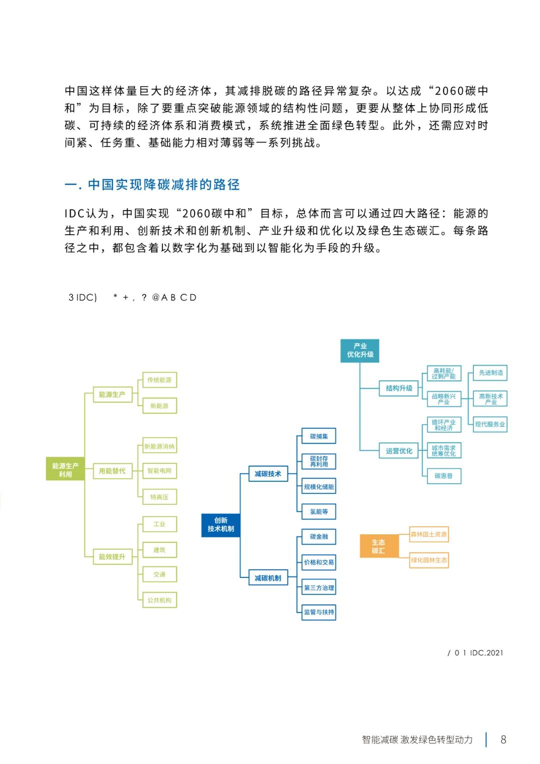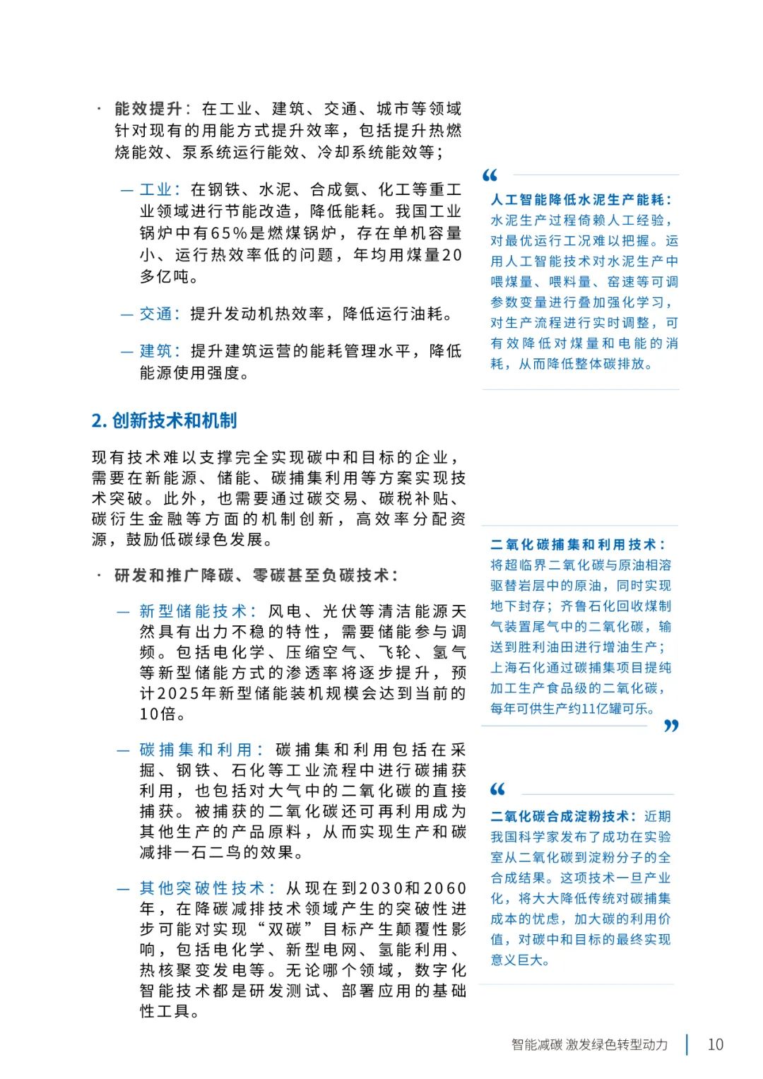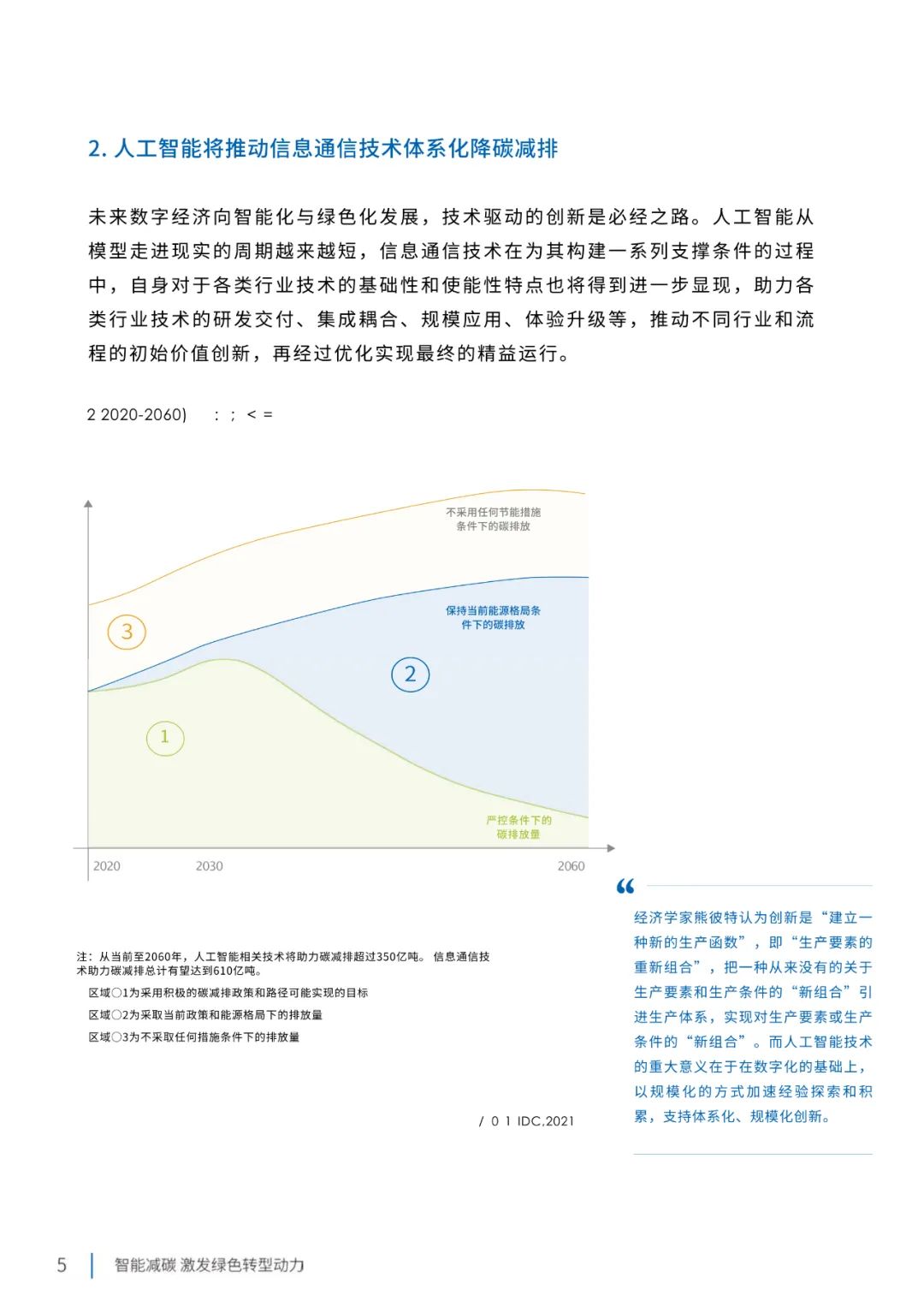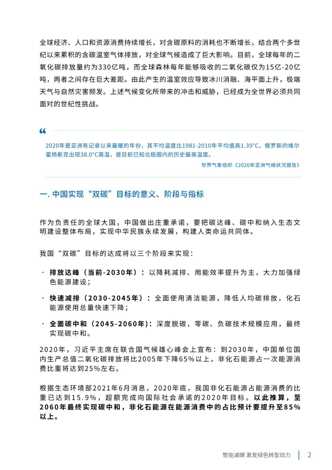 随着“力争在 2 0 3 0年前实现碳达峰, 2 0 6 0年前实现碳中和”成为国家重大战略决策,各界已积极行动起来,对如何实现上述宏观目标的方法、路径和阶段,展开了不同角度的有益讨论。当前,人工智能(AI)、云计算等技术正以惊人的速度成长,不仅向各个产业场景深度渗透,并使信息通信技术(ICT)的基础性和使能性特点得到进一步突显,构建起数字经济整体发展的智能化底座。这一创新变革将在实现“双碳”目标的实践中发挥怎样的作用、能做出怎样的贡献,是本白皮书主要讨论的议题。同时希望形成以下三点影响:1. 基础认知:增强读者对于中国达成“双碳”目标整体概况的认识;2. 启发探讨:梳理人工智能及信息通信技术应用于行业降碳减排的作用,以及未来着力方向;3. 呼吁行动:达成共识并促进业界各方实施行动。